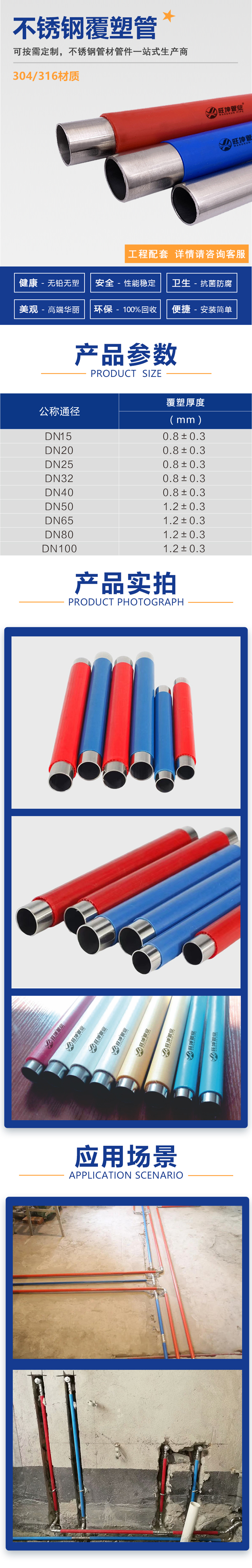 1、不锈钢管参照GB/T12771-2008,GB/T19228.2-2011,CJ/T152-2010等相关国家标准及行业标准;从DN10到DN300共多种规格;管道内壁光滑,不结垢、卫生、无污染、耐腐蚀正常使用能达到100年。