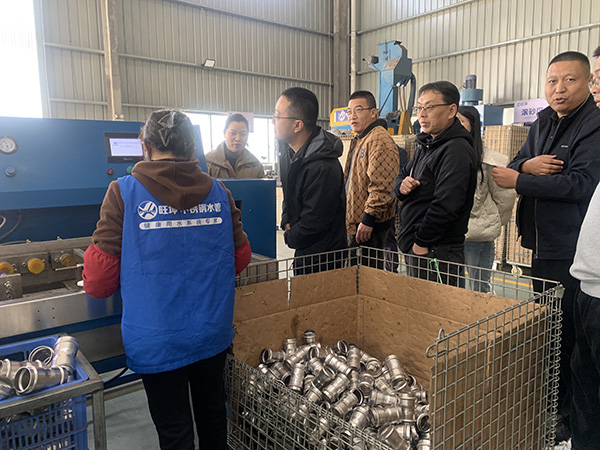 管件展示:考察团详细查看了包括法兰、弯头、三通及先进的卡压式管件在内的全套连接系统,对产品的精湛工艺与完善体系表示赞赏。